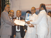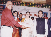 Honorable Chief Minister of the Andhra Pradesh Dr. Y.S. Rajsekhar Reddy awarding "Best Tourism Educational Institute" sponsored by AP State tourism Department in the year 2007. Also In picture Mr. V Pujari Chairman of Indo American Group.